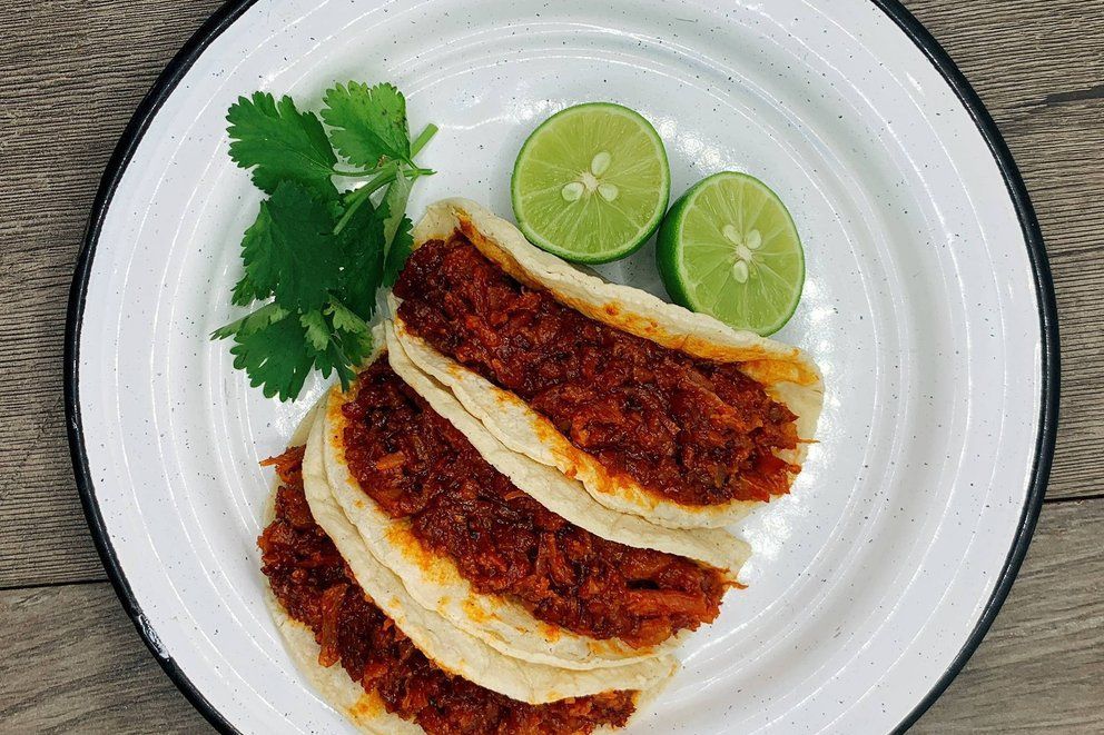 Taco en chicharrón rojo en tortilla de maiz.