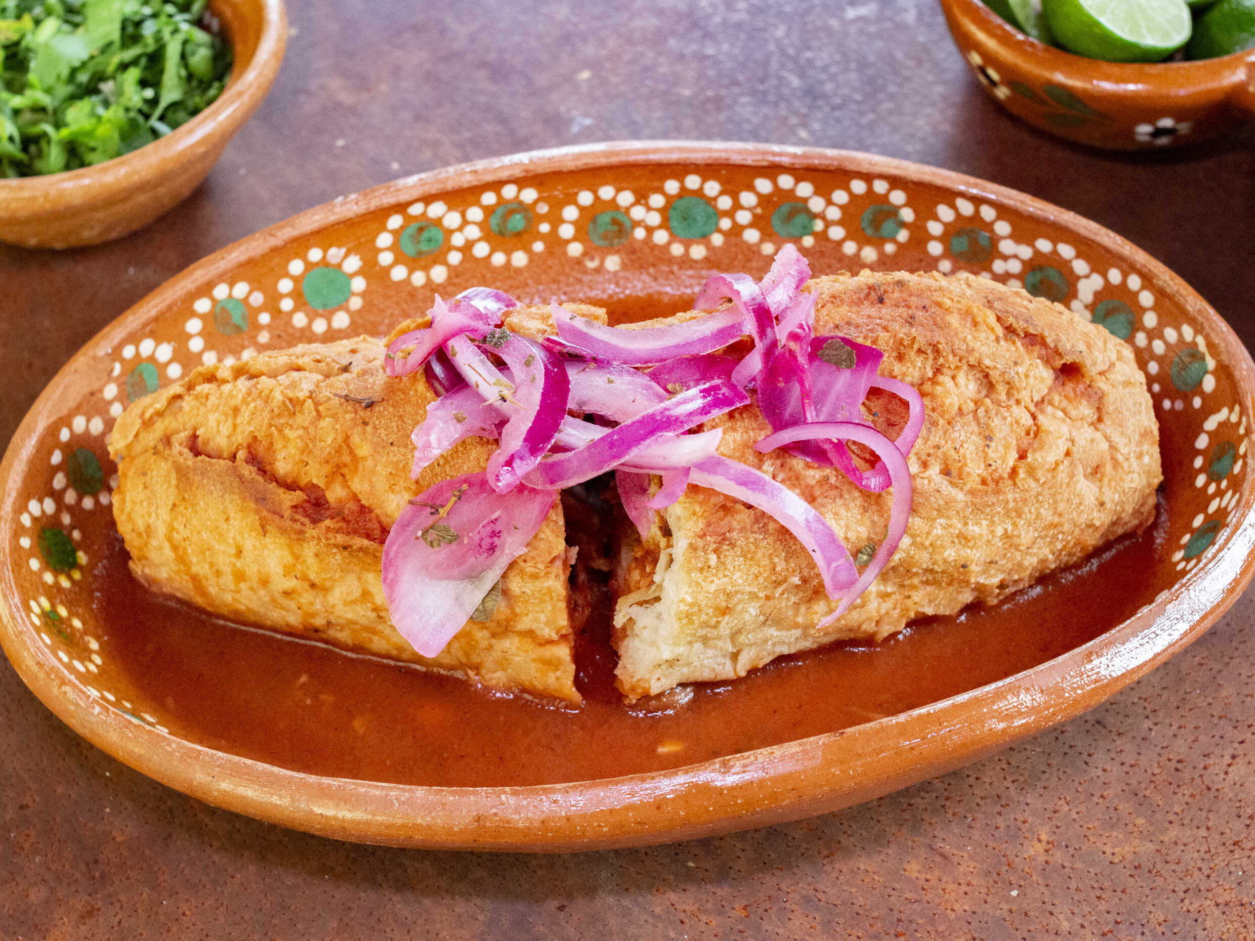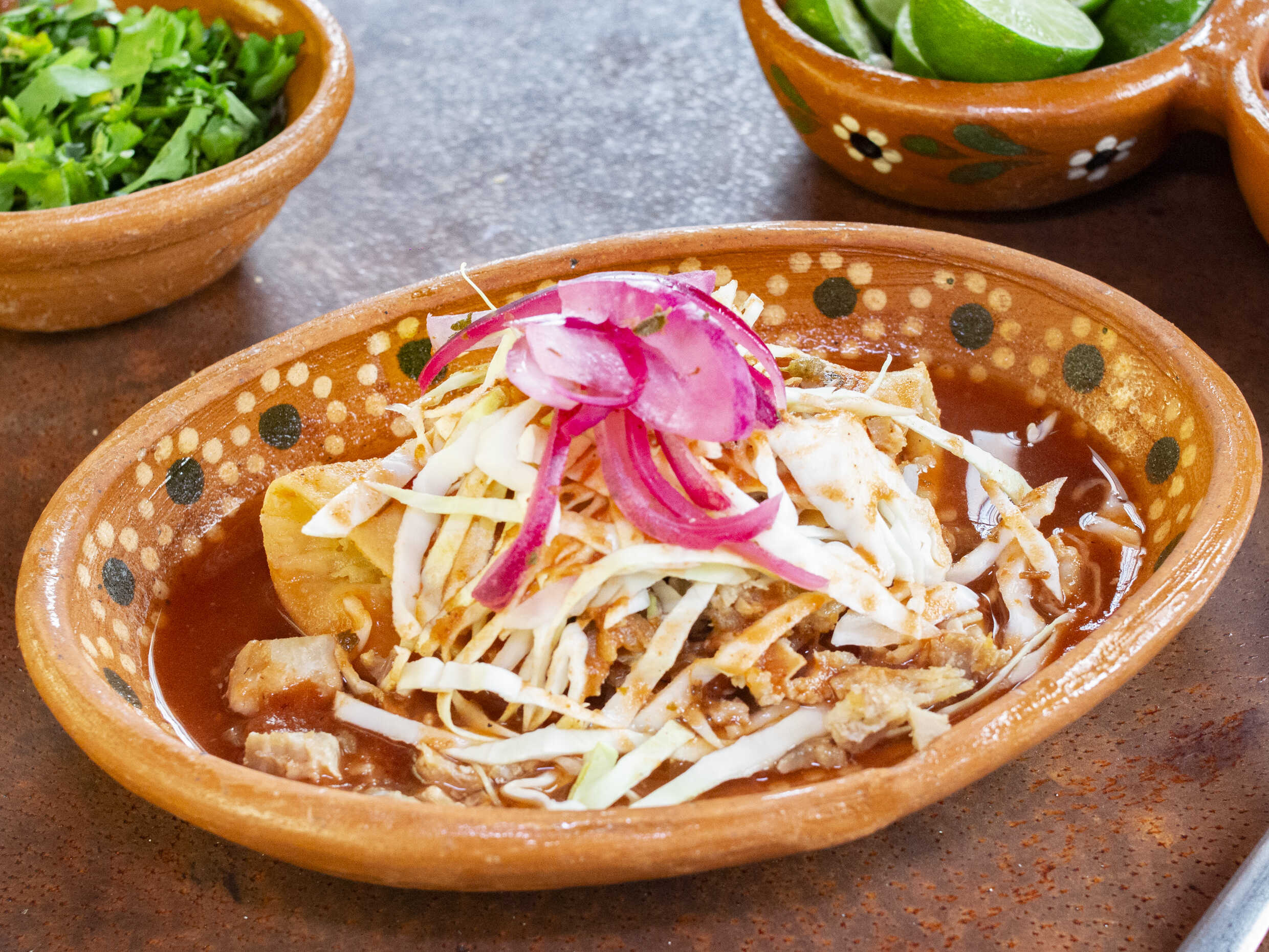 Incluye: frijoles, carnitas, repollo, cebolla, bañado en salsa de torta ahogada.