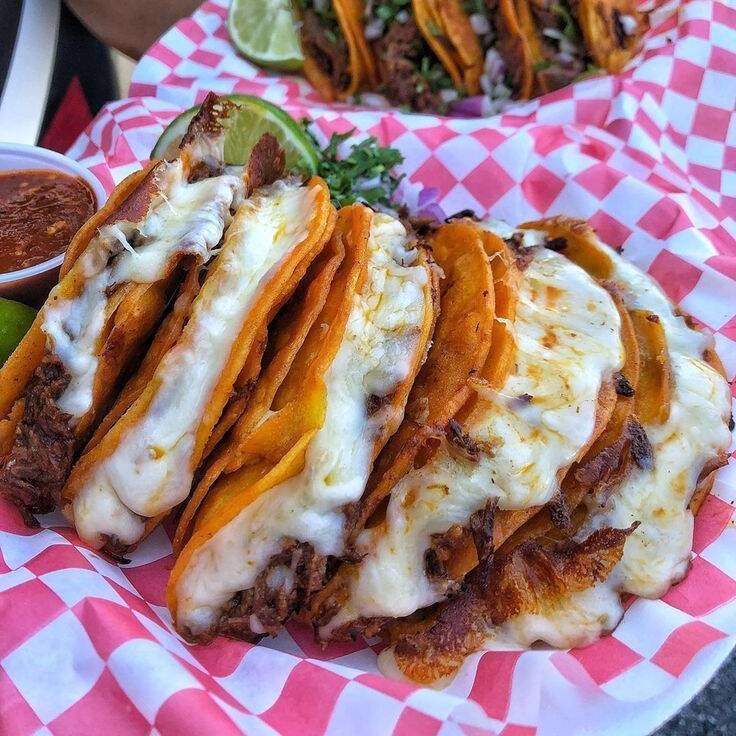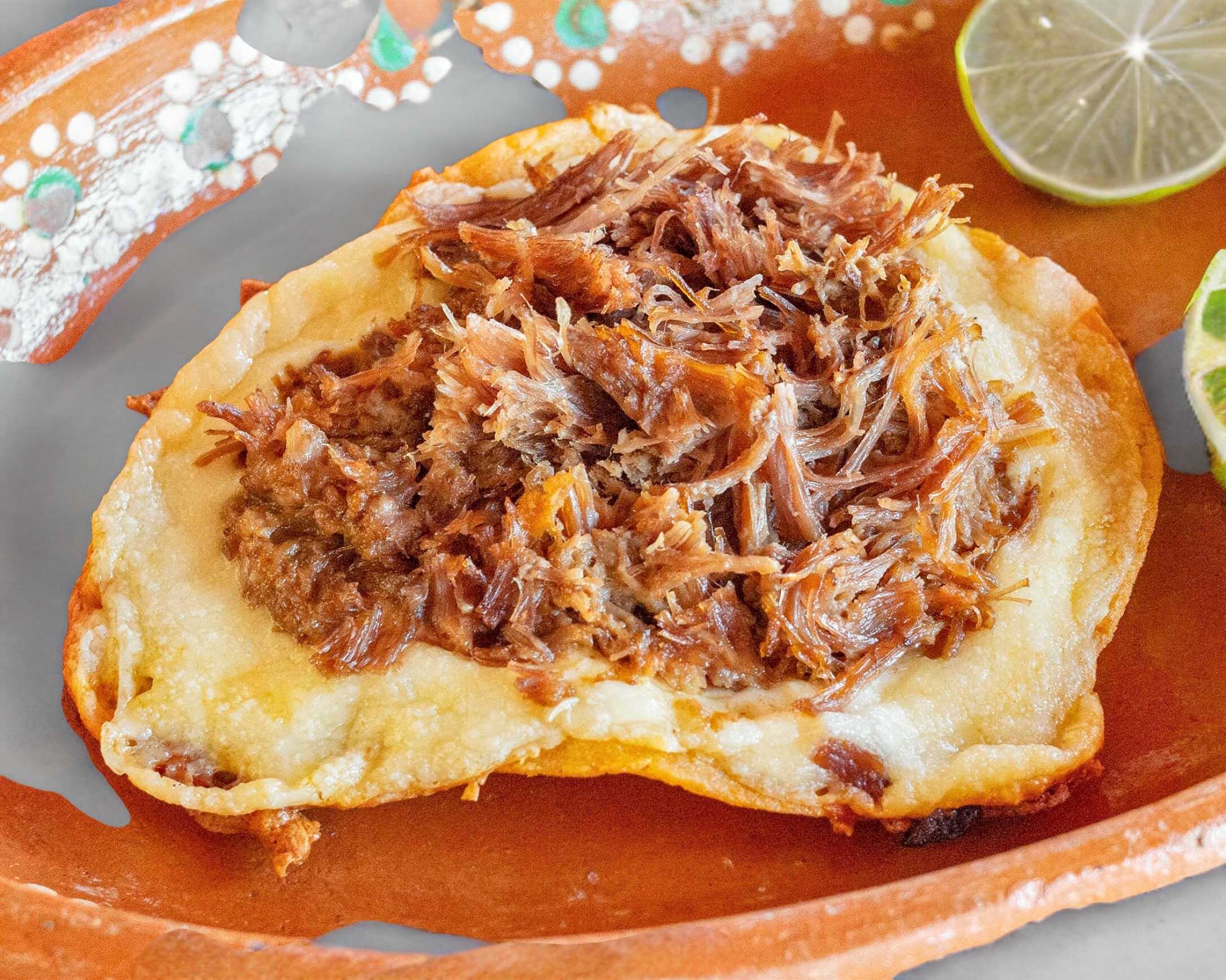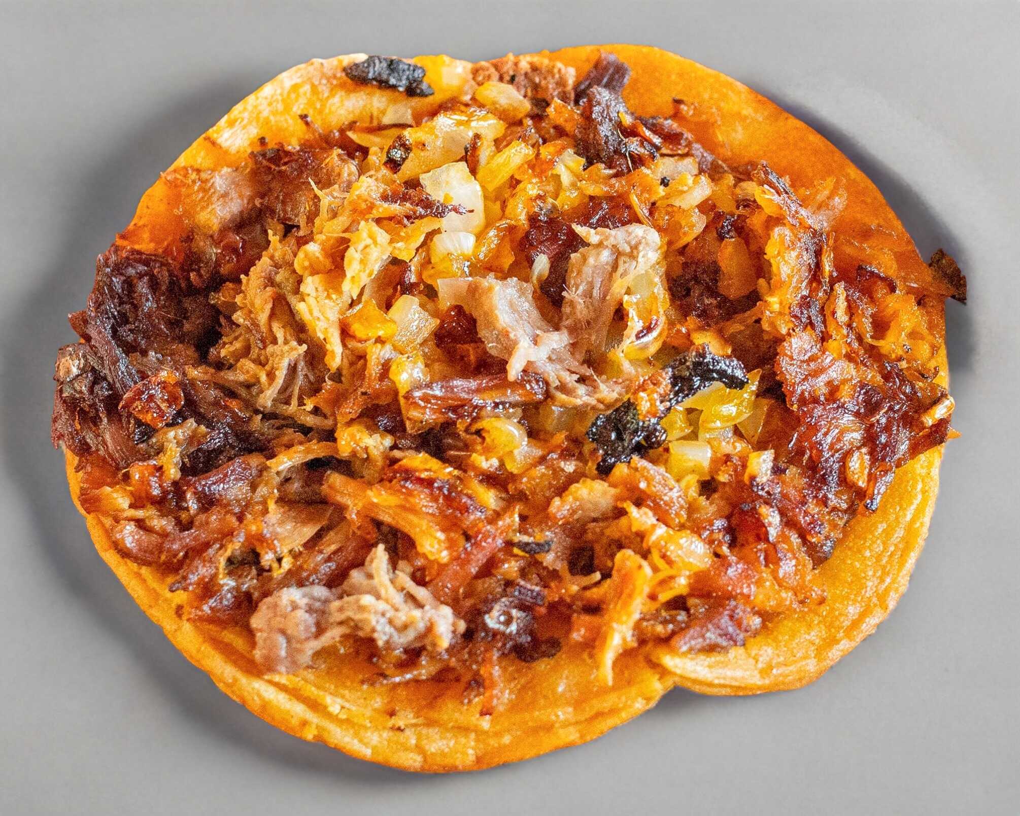 Tortilla doradita, queso gratinado y arriba la carne. Incluye salsa, cebolla y limón.