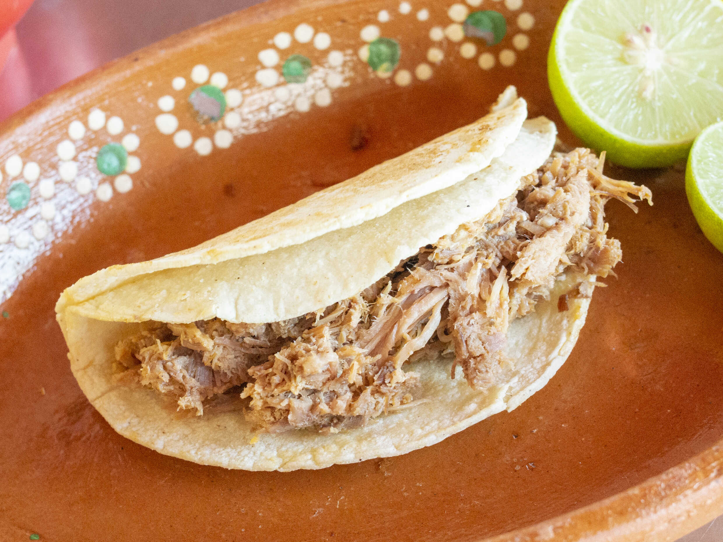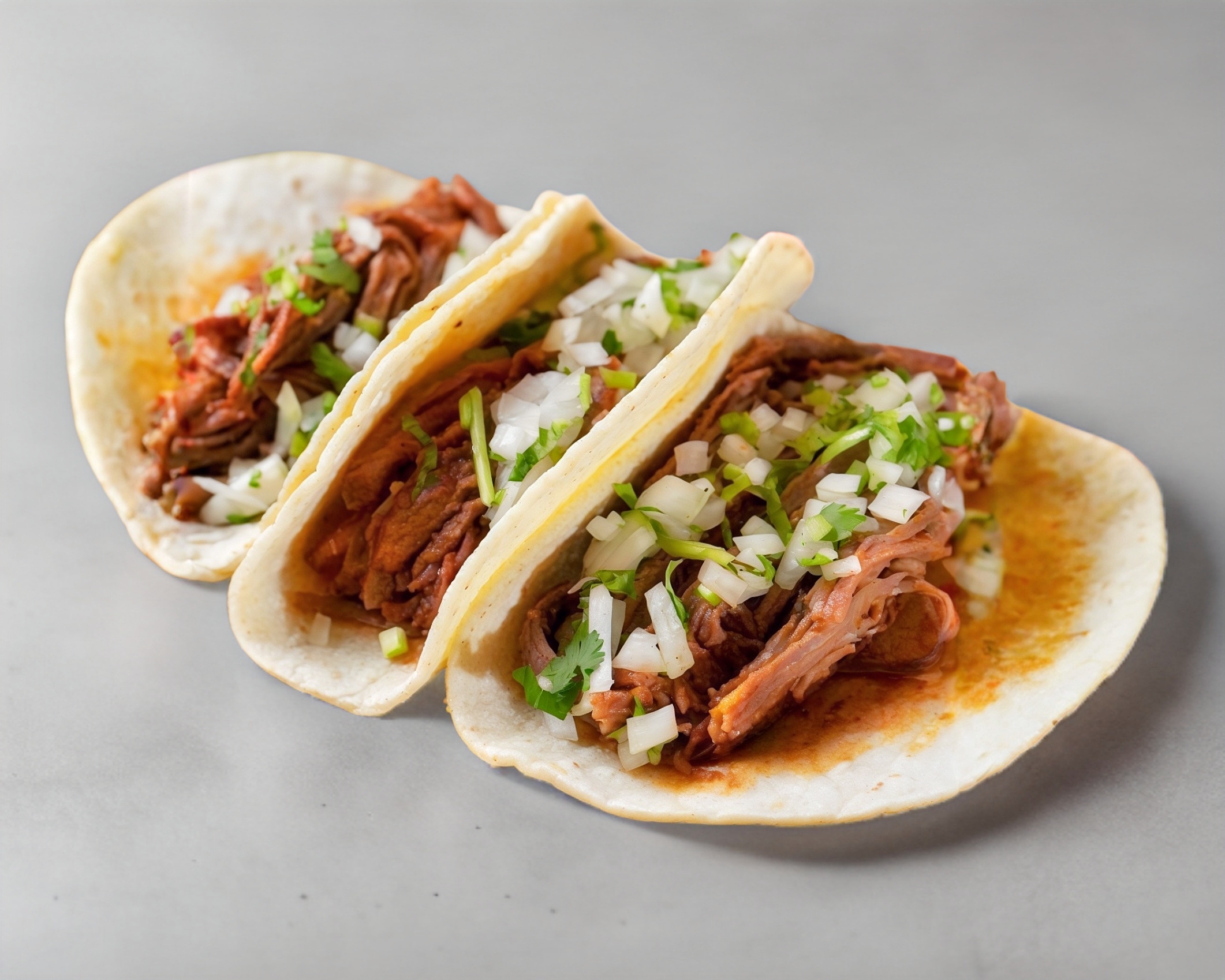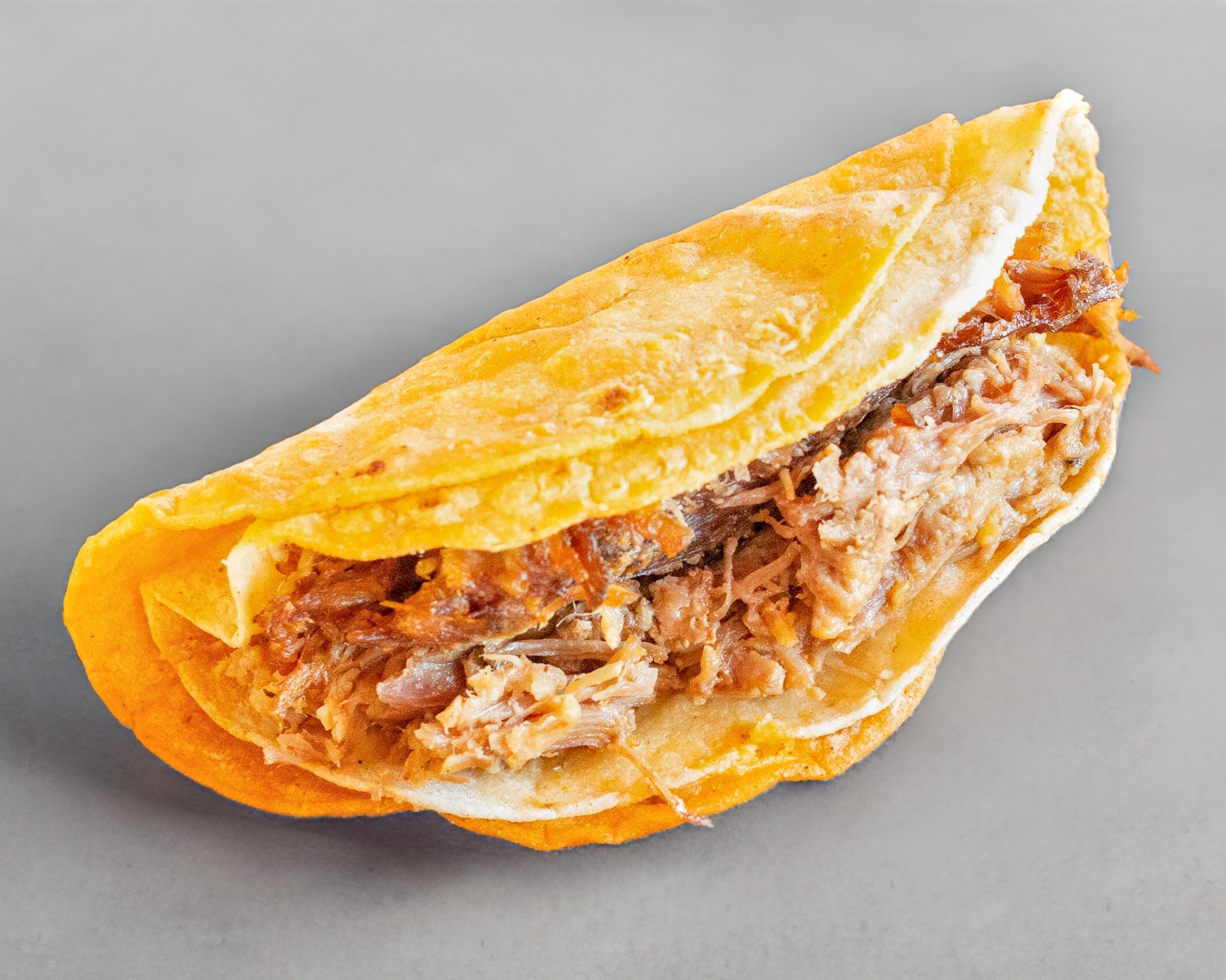 Tortilla doradita, queso gratinado y arriba la carne. Incluye salsa, cebolla y limón.