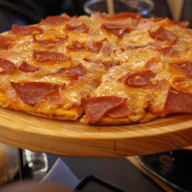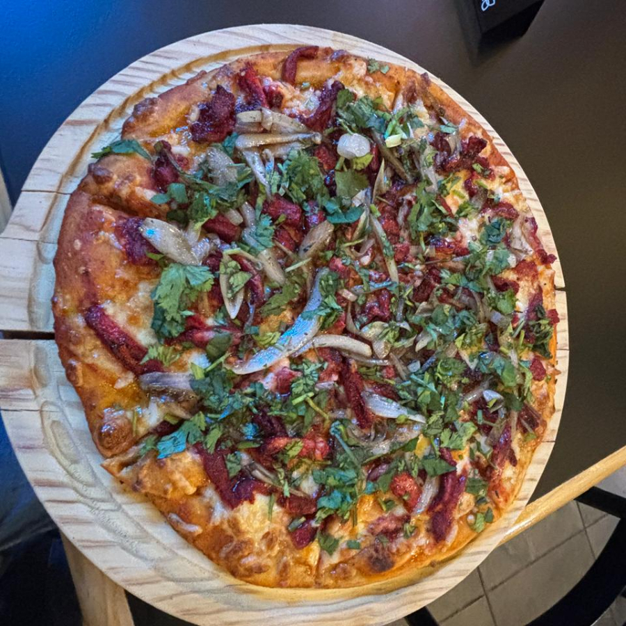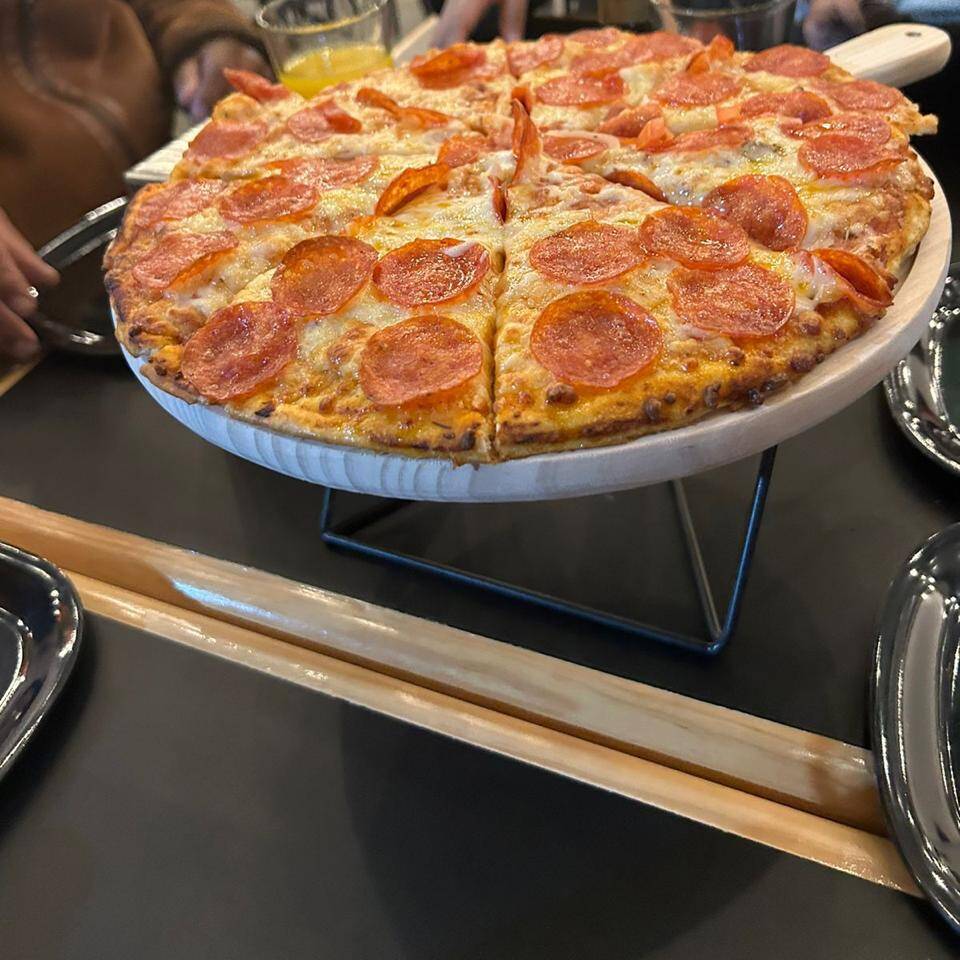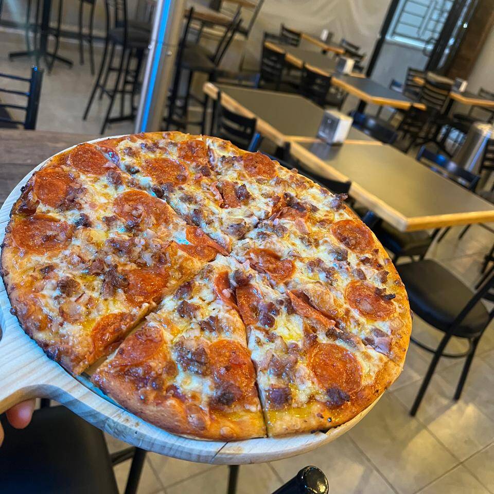 PIZZA CON SIRLON AL CARBON, TOCINA Y PEPERONI