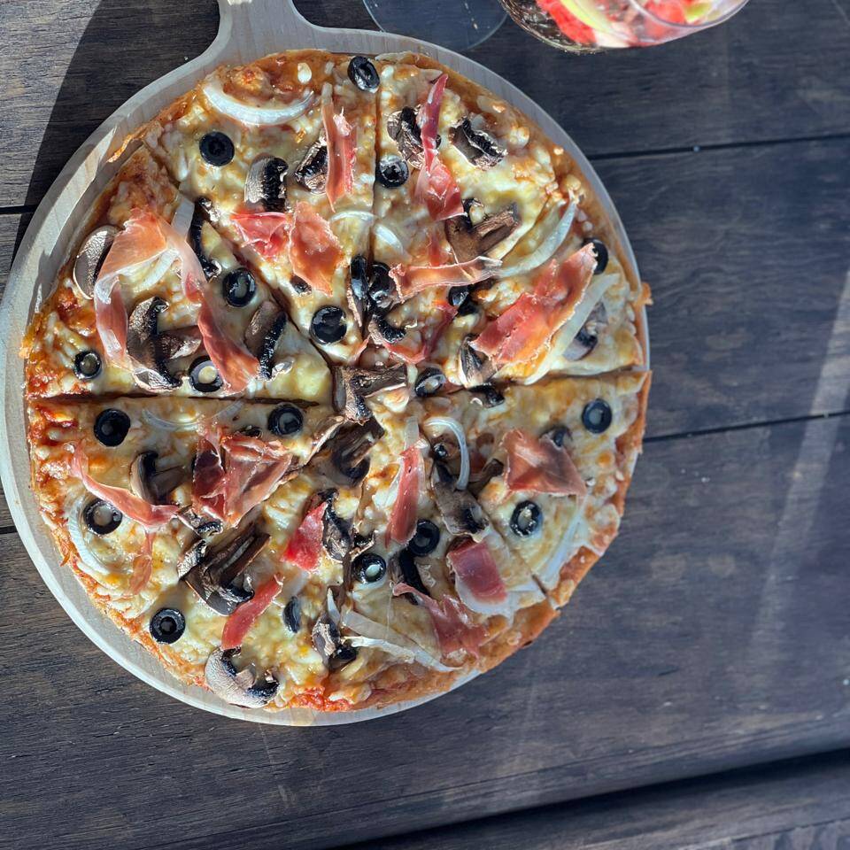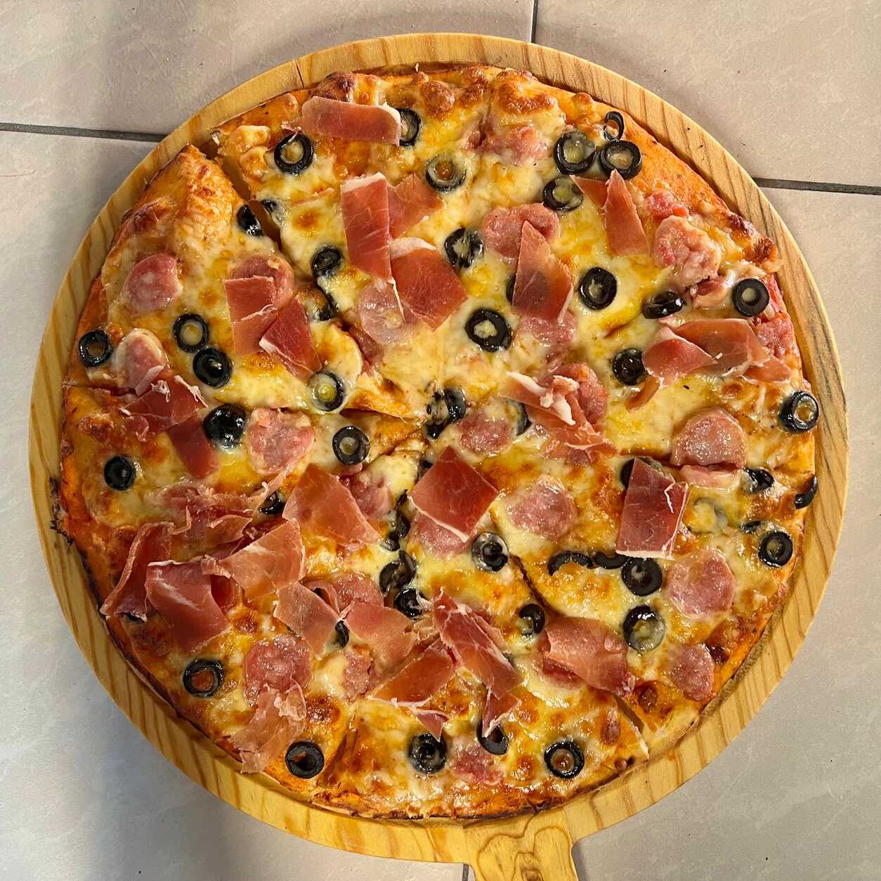 CHAMPIÑON,CEBOLLA, ACEITUNA NEGRA Y JAMON SERRANO