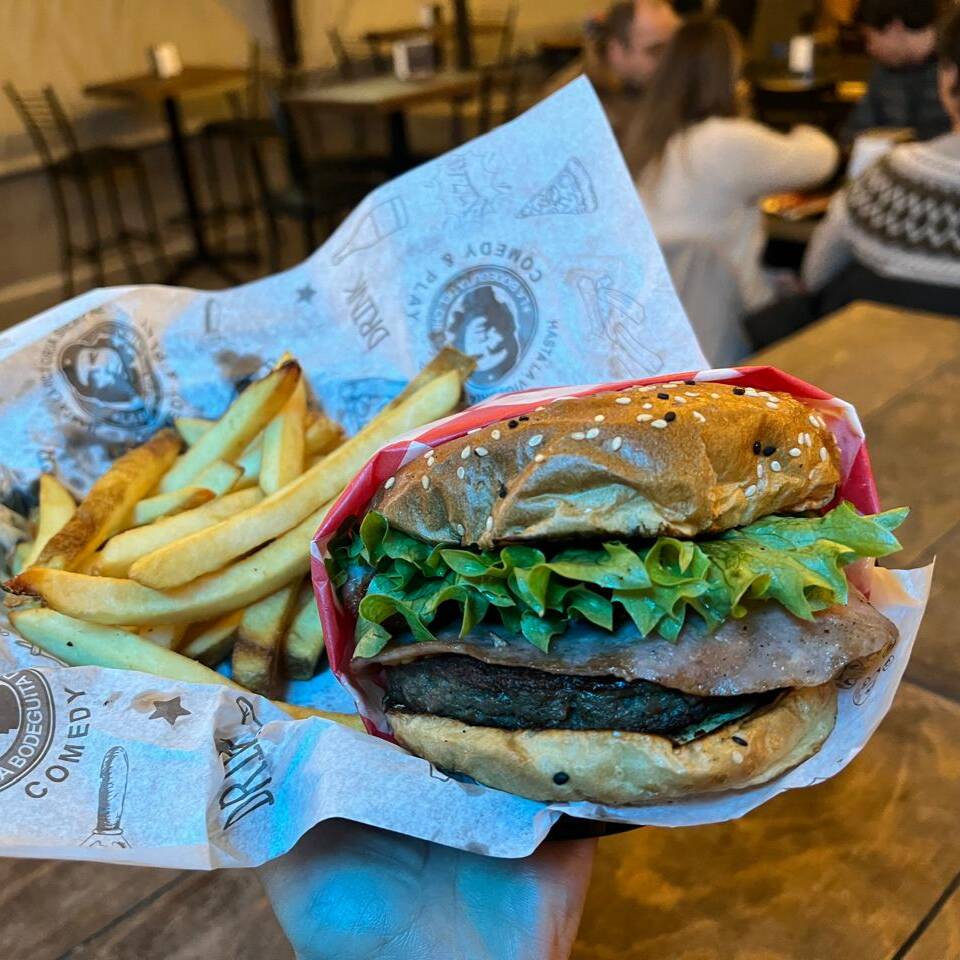 CARNE DE SIRLON, LECHUGA QUESO AMERICANO, CEBOLLA Y TOCINO ACOMPAÑADO DE PAPAS A LA FRTANCESA