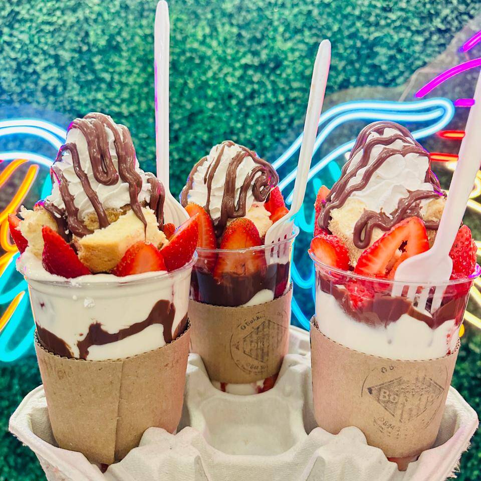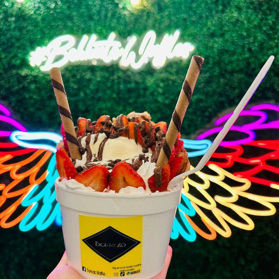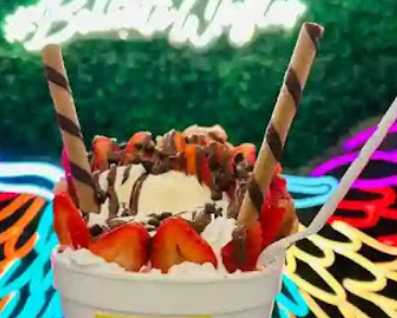 Chocolate, lechera, fresa, nieve, Nutella y crema batida.