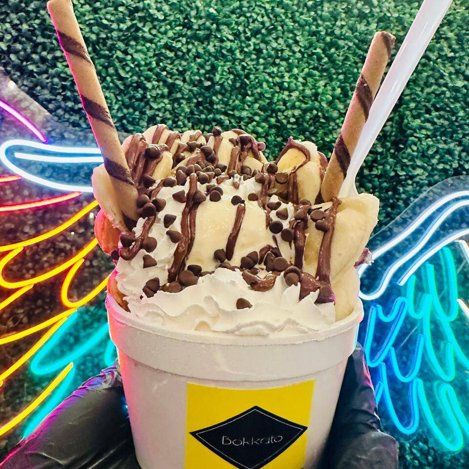 Chocolate, lechera, plátano, fresa, kiwi, nieve, Nutella, crema batida y chispas de chocolate.