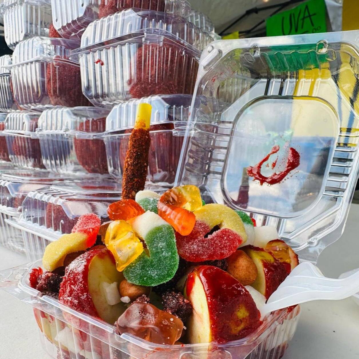 Fruta picada, gomitas, cacahuate, dulces de tamarindo, miguelito y chamoy.