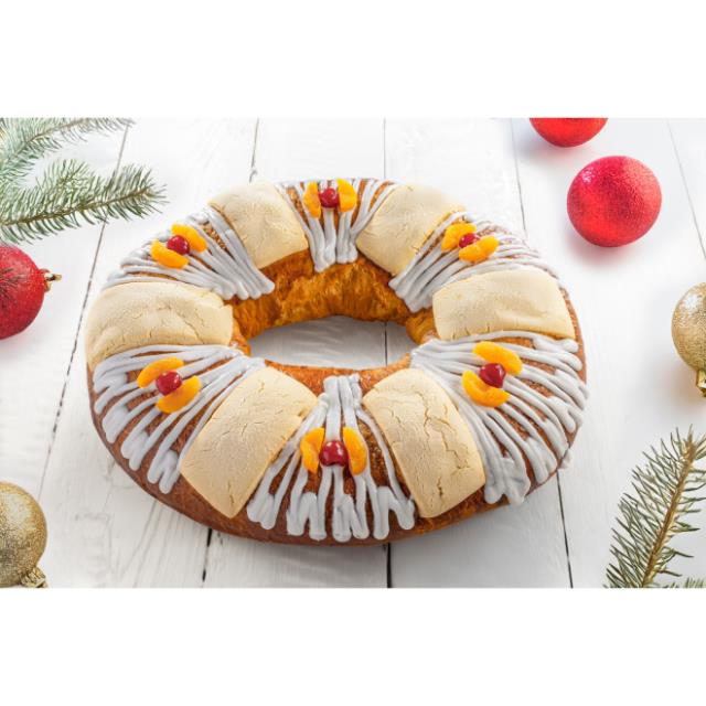 Delicioso pan dulce tradicional en forma ovalada , decorada con cubierta de concha de vainilla, chocolate blanco, chabacano y cereza, rinde 14 pers.