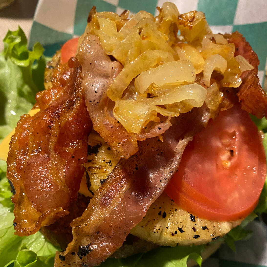 Carne de sirloin, queso americano, queso manchego, piña asada, tocino, jamón de pavo, lechuga italiana, aguacate, tomate, mayonesa, mostaza, cátsup, cebolla caramellizada