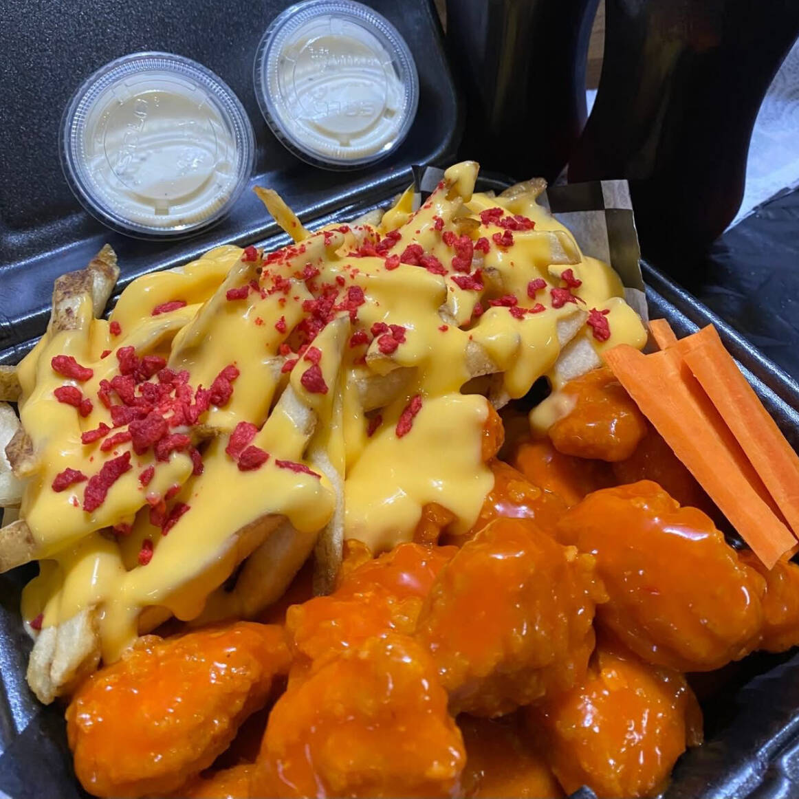 Incluye 7pzas de boneless en la salsa de tu preferencia, una porción de papas a la fracesa con queso amarillo y tocino deshidratado, zanahora y aderezo ranch