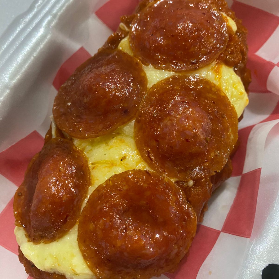 Empanizado de panko, salsa de tomate, queso manchego y pepperoni encima