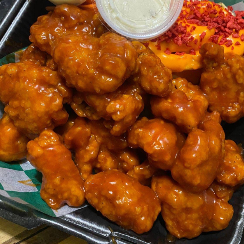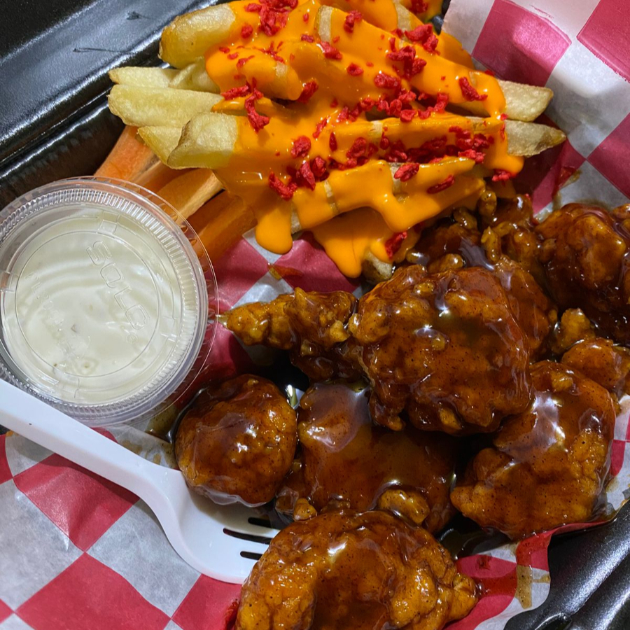Boneless bañados en la salsa de tu preferencia, zanahoria, aderezo ranch y porción de papas a la francesa