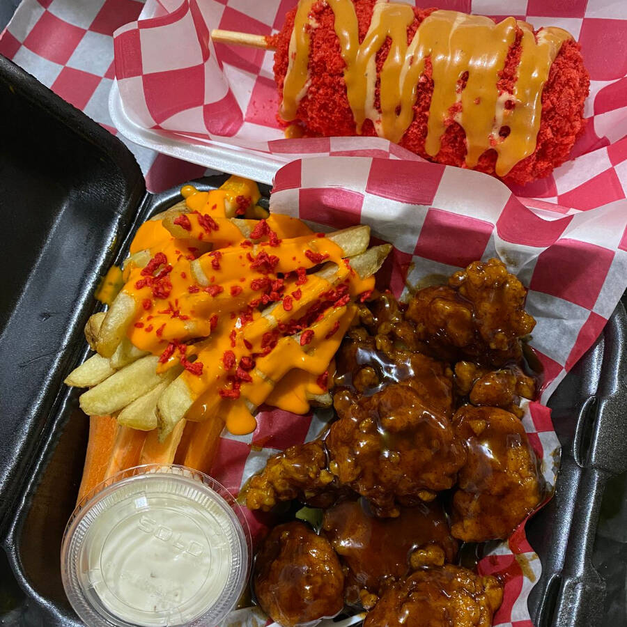 1/2 KILO DE BONELESS*1 + 1/2 KILO DE ALITAS*1 + ORDEN DE PAPAS A LA FRANCESA*1 + BANDERILLA COREANA ESPECIAL*2 + HAMBURGUESA CLÁSICA*2