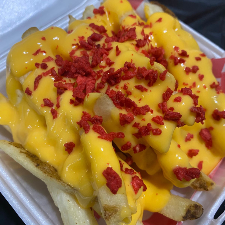 Orden individual con papas bañadas en queso y con tocino deshidratado