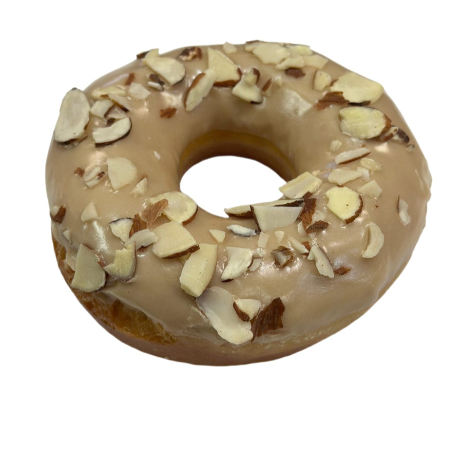 Dona cubierta de vainilla-maple con Trozos de almendra como topping
