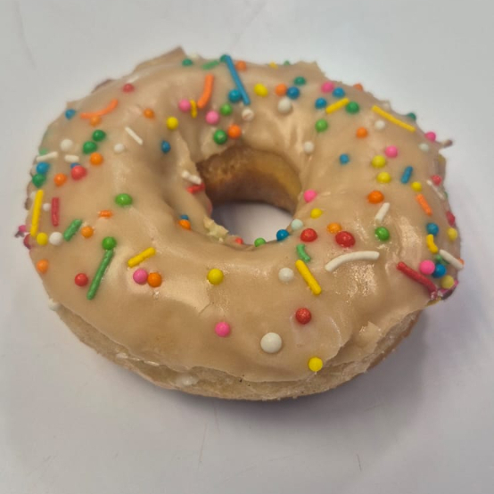 Dona con cubierta sabor vainilla-maple con gragea de colores como topping