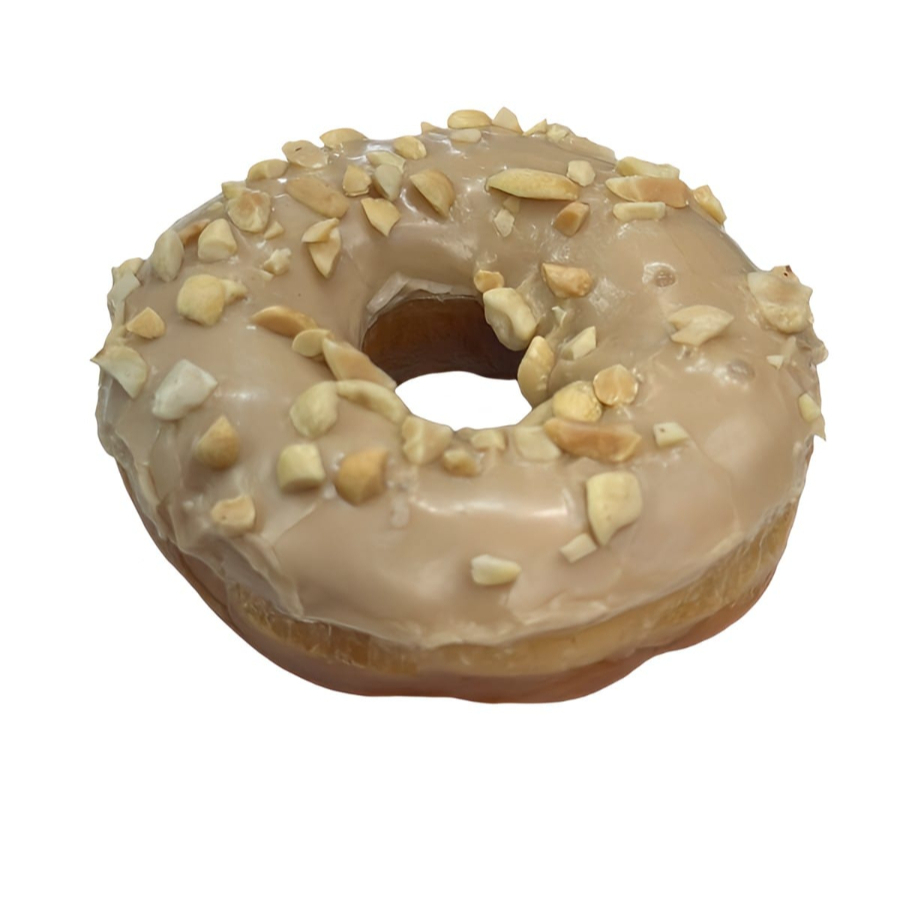 Dona con cubierta sabor vainilla-maple con trozos de cacahuate triturado como topping