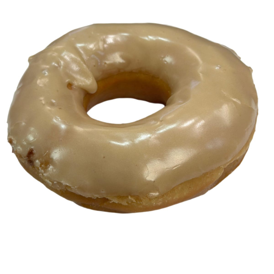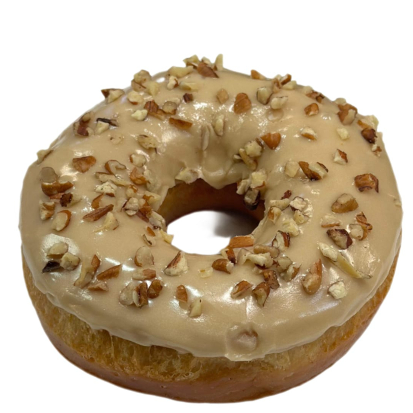 Dona con cubierta sabor vainilla-maple con trozos de nuez triturada como topping