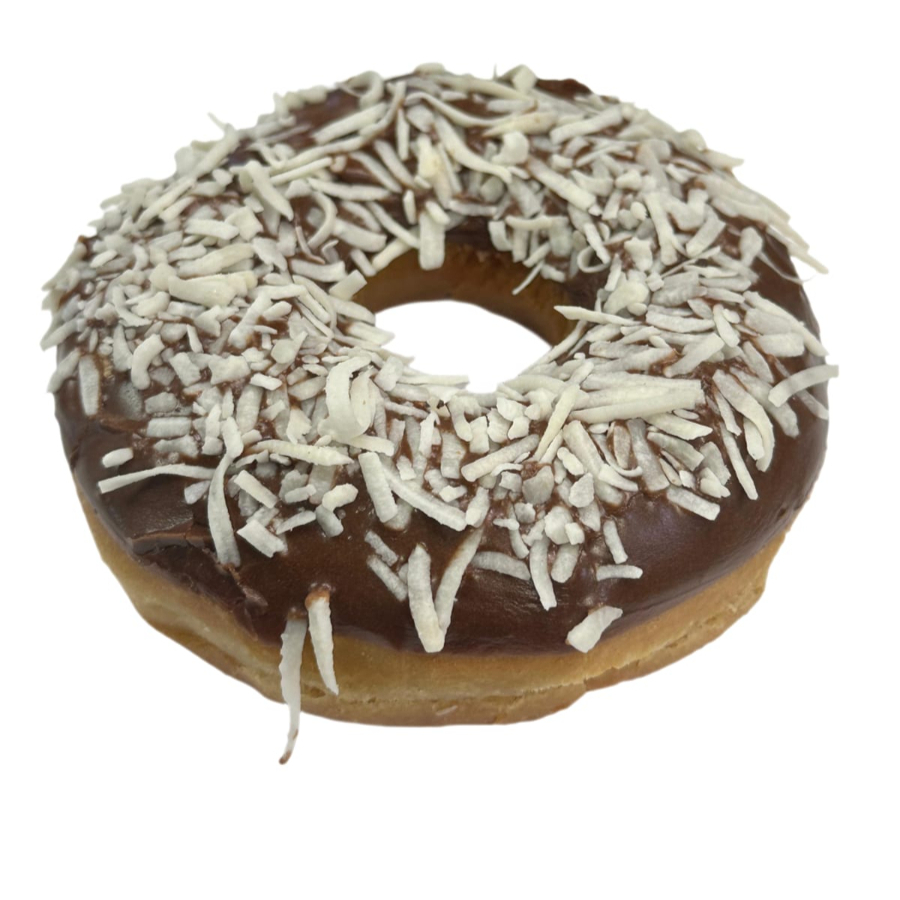Dona cubierta de chocolate HERSHEY con coco rallado como topping
