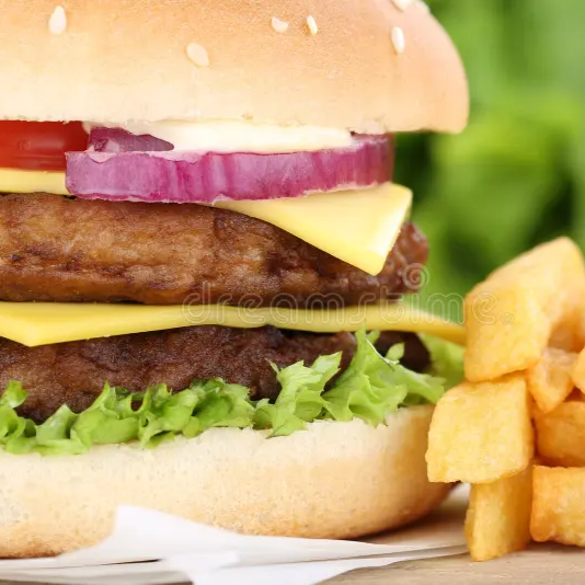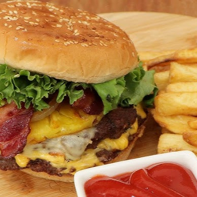 Pan, carne, queso amarillo, tomate, cebolla dorada, lechuga, cátsup, mayonesa, mostaza.