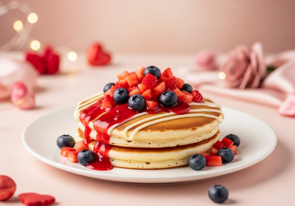 Celebra el amor con nuestros deliciosos pancakes de mezcla de cheesecake, salsa de frutos rojos, fresas y arándanos. ¡Dulzura que enamora en cada bocado!