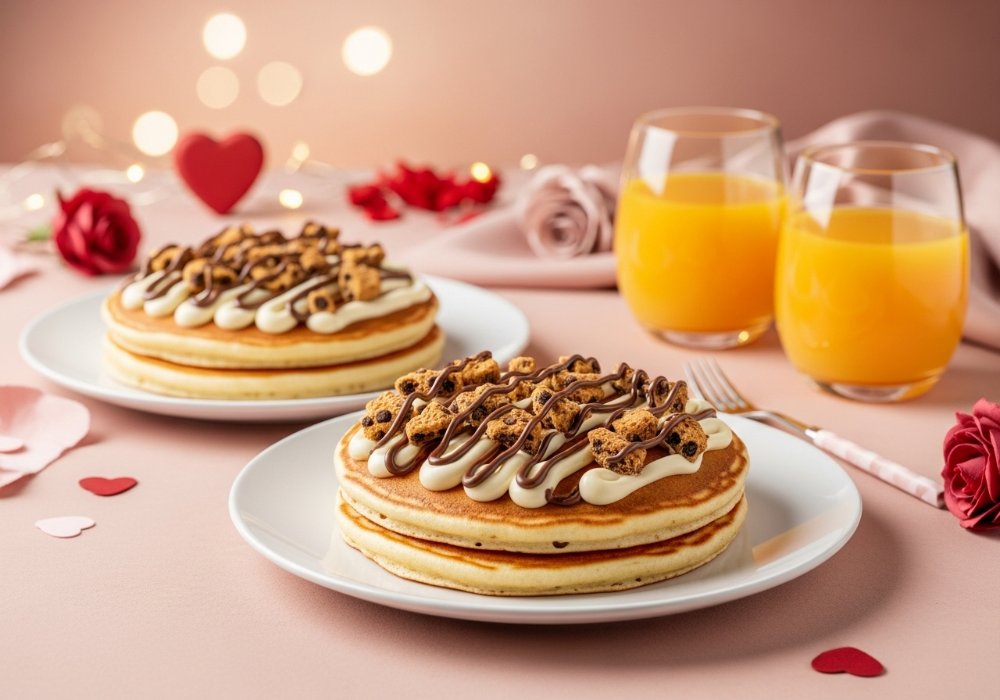 Comparte el amor con nuestro combo especial: 2 Cupid´s Cookie Pancakes y 2 jugos de naranja. ¡Celebra San Valentín con sabor y dulzura!