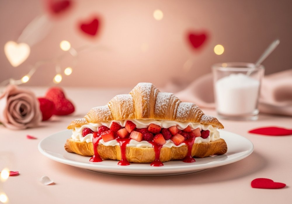 Celebra el amor con nuestro nuevo croissan de mezcla de cheesecake, salsa de frutos rojos, y fresas. ¡Dulzura que enamora en cada bocado!