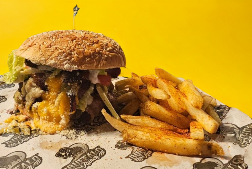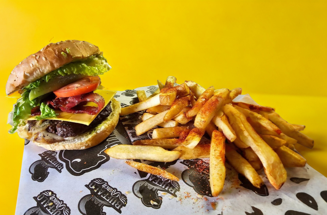 Carne de res con aros de cebolla, tocino crujiente, salsa rancho BBQ y queso manchego, incluye papas a la francesa