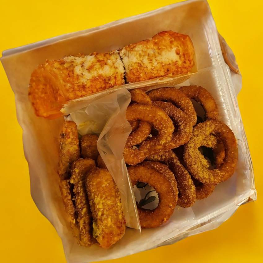 Tocino, salchicha para asar, queso manchego, carne de res, aros de cebolla sazonados