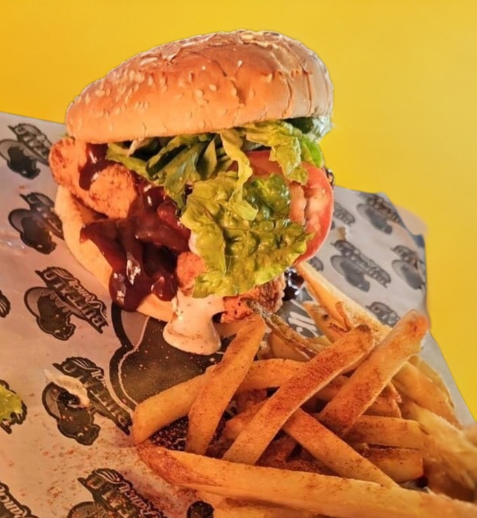 Pechuga de pollo empanizado bañados con salsa BBQ, lechuga, tomate, aderezo ranch y queso manchego