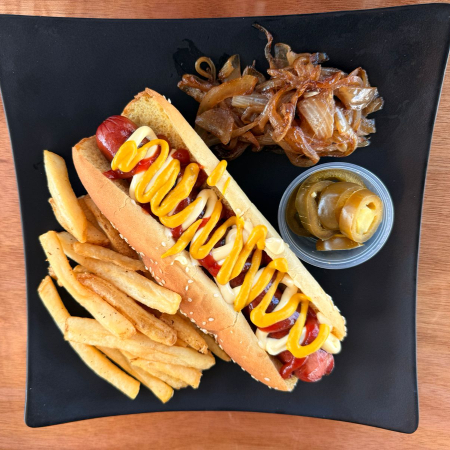 Pan extra grande, salchicha jumbo 100% de res y los aderezos clasicos (mayonesa, catsup, mostaza), incluye 200gr de papas, chiles en vinagre y cebolla asada