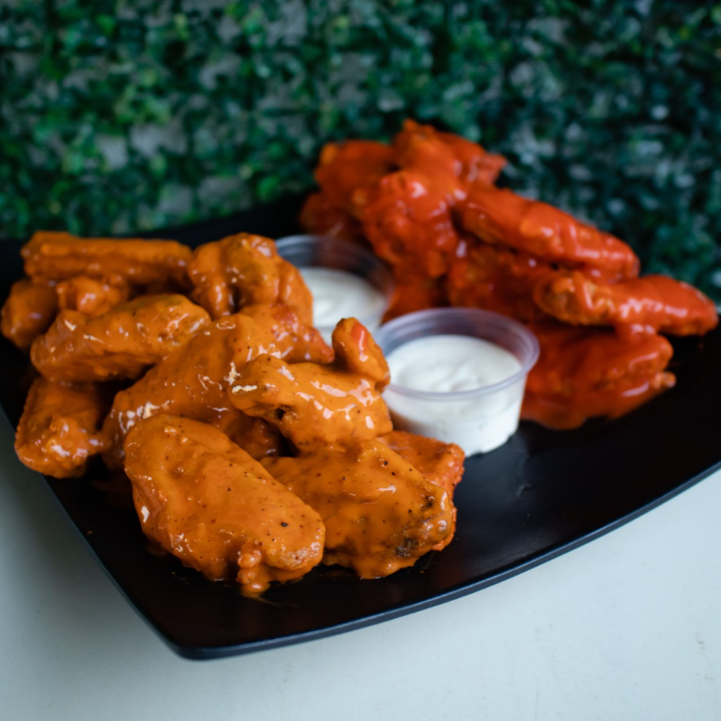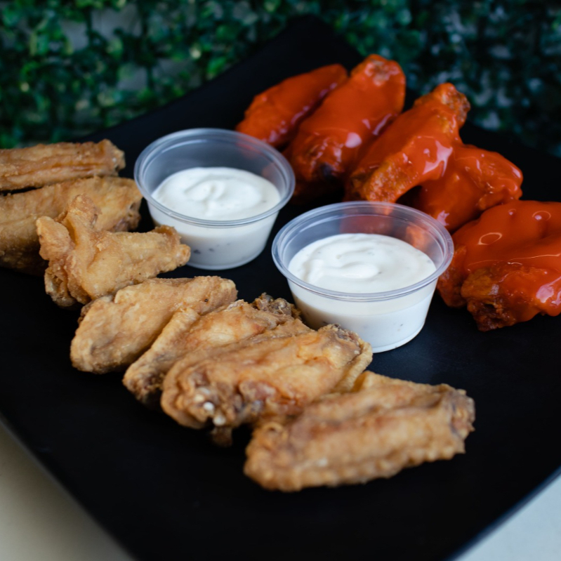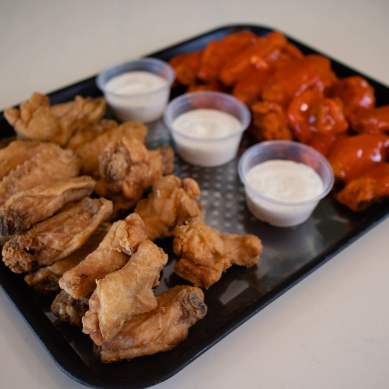 26 alitas bañadas en una o dos salsas, incluye dos ranch