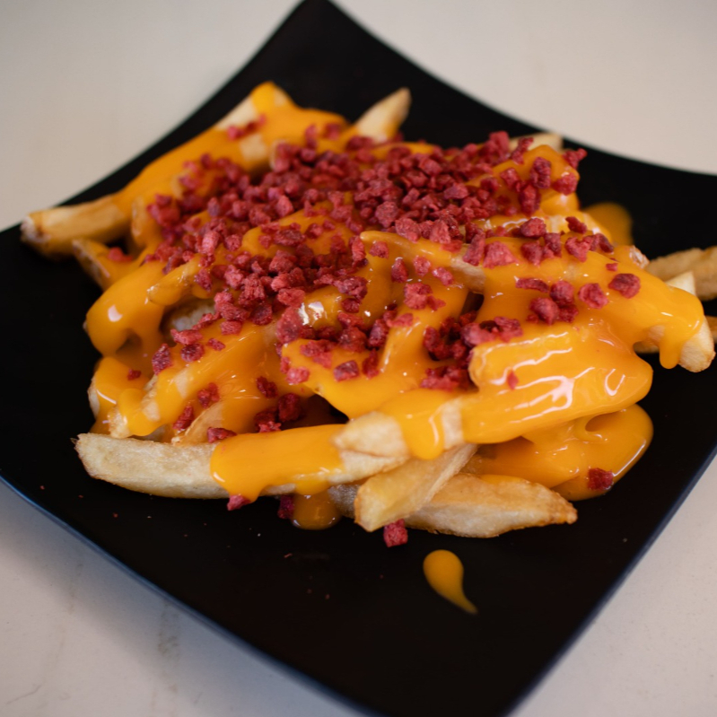 Papas a la francesa con queso y tocino deshidratado