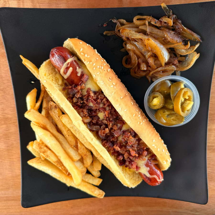 Pan extra grande, salchicha jumbo 100% de res, queso manchego gratinado, tocino picado doradito y los aderezos clasicos (mayonesa, catsup, mostaza), incluye 200gr de papas, chiles en vinagre y cebolla asada
