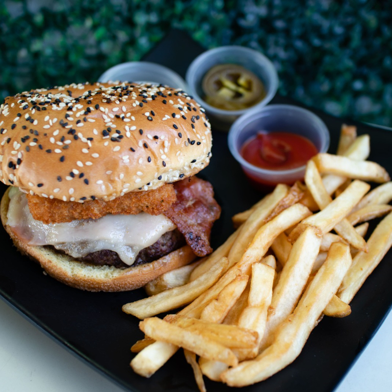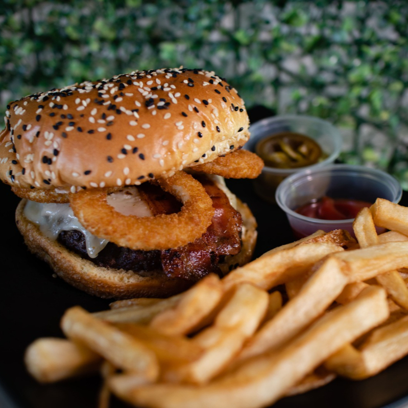 carne angus hecha en casa, aros de cebolla, queso manchego y tocino (incluye papas, catsup, chiles jalapeño y aderezo chipotle)