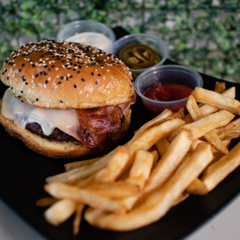 Carne angus hecha en casa con queso manchego, tocino y dos dedos de queso (incluye catsup, chiles jalapeño y ranch) incluye papas