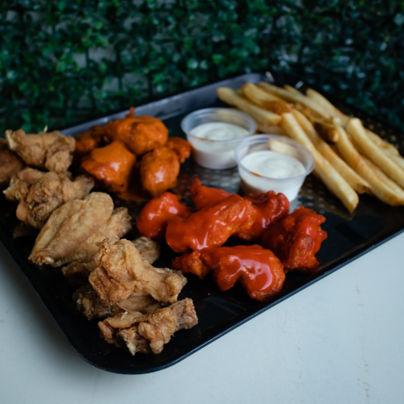 10 Alitas, 10 boneless, 350 gr de papas, 7 aros de cebolla, 4 dedos de queso y 3 chiles rellenos.