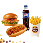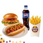 3 Hamburguesas de res, 3 hot dogs, 1 orden de alitas de 12 a 14 piezas, 2 ordenes de papas grandes, 1 refresco de 2 Litros.