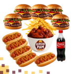 5 Hamburguesas de res, 5 hot dog, 1 orden de alitas de 16 piezas, 2 ordenes de papas grandes, 1 refresco de 2 Litros.