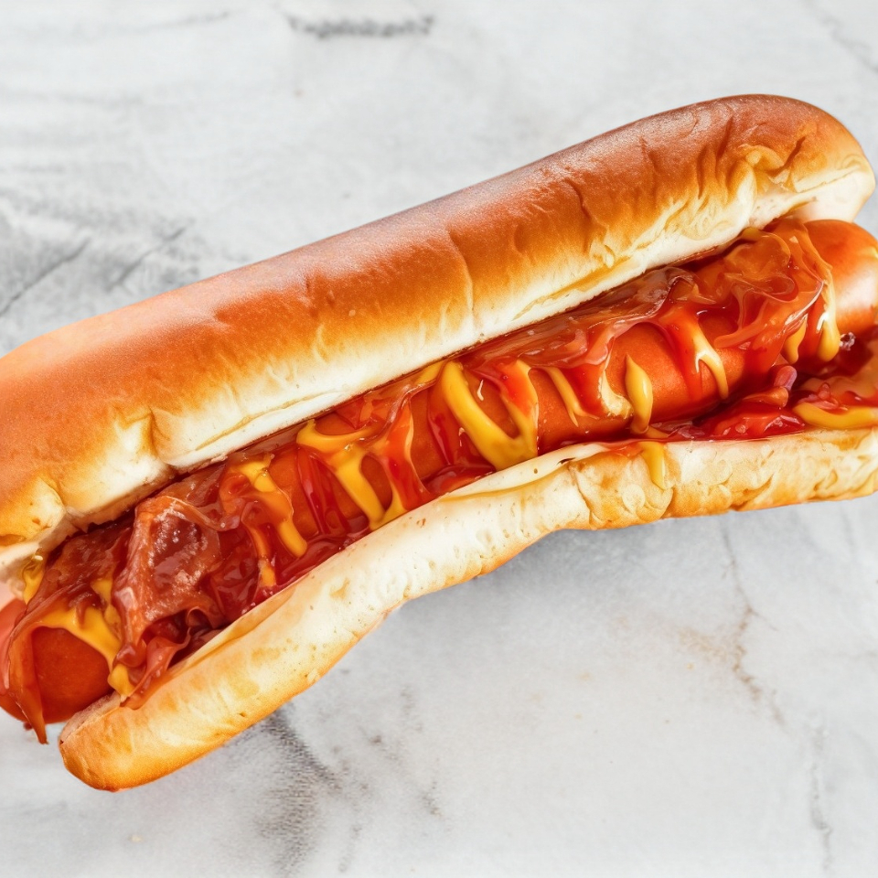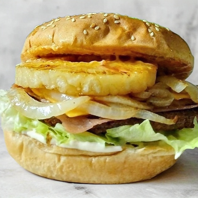 Base de mayonesa, catsup, lechuga , carne jamón, queso americano cubierta de piña, cebolla caramelizada y BBQ.