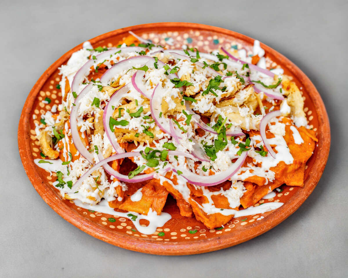Totopos bañados en salsa poblana con pollo deshebrado, queso ranchero, crema, cilantro y julianas de cebolla morada