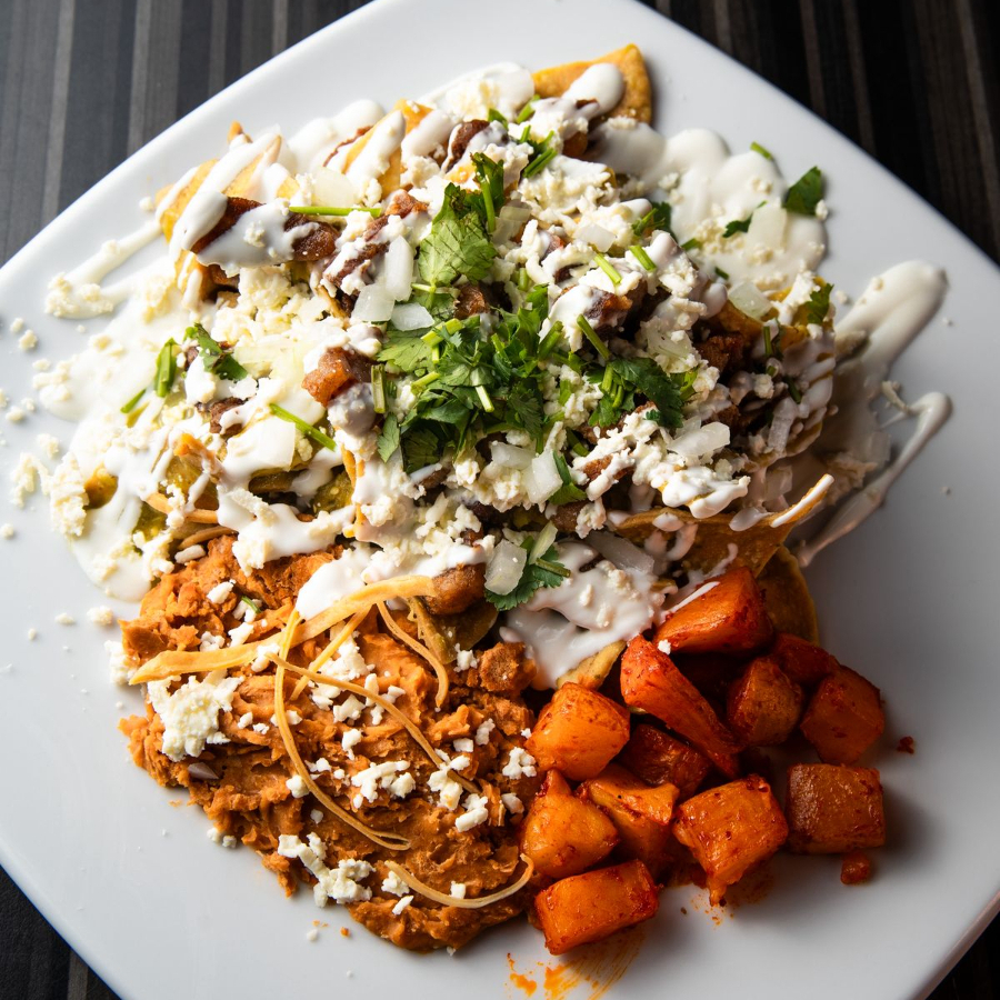 Totopos bañados en salsa verde o roja con pollo deshebrado, queso ranchero, crema, cebolla morada y cilantro acaompañados de frijoles refritos y papas guisadas