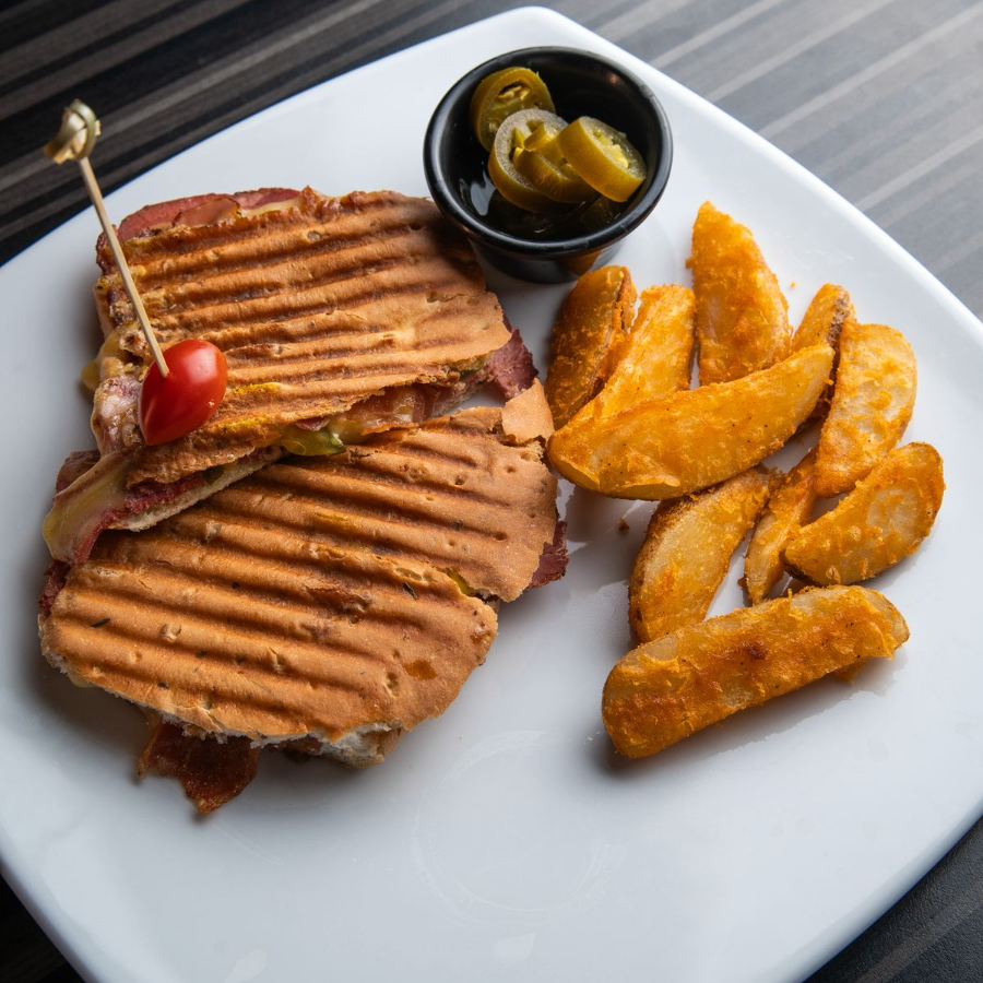 Pechuga de pavo, queso manhengo, lechuga, tomate y cebolla. Acompañado con papas gajo