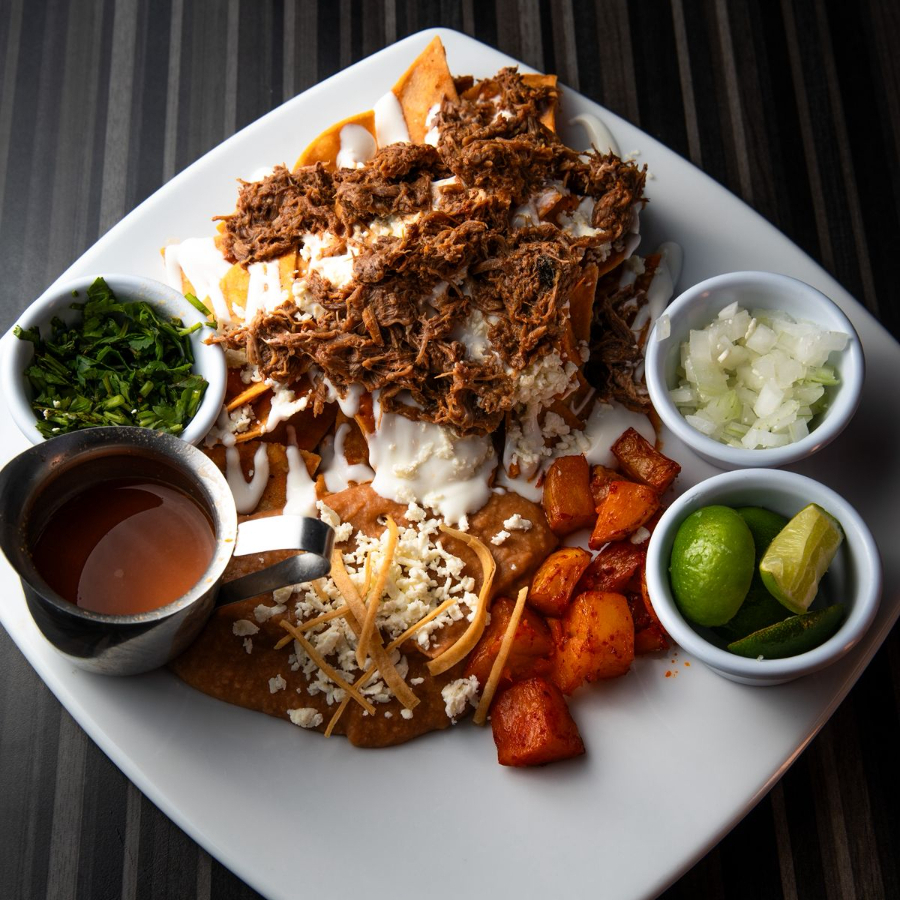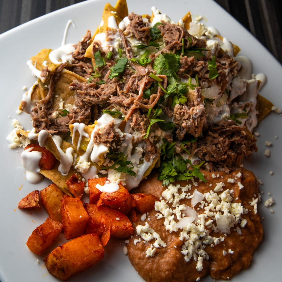 Totopos bañados en salsa verde con rica barbacoa, queso ranchero, crema, cebolla morada y cilantro acaompañados de frijoles refritos