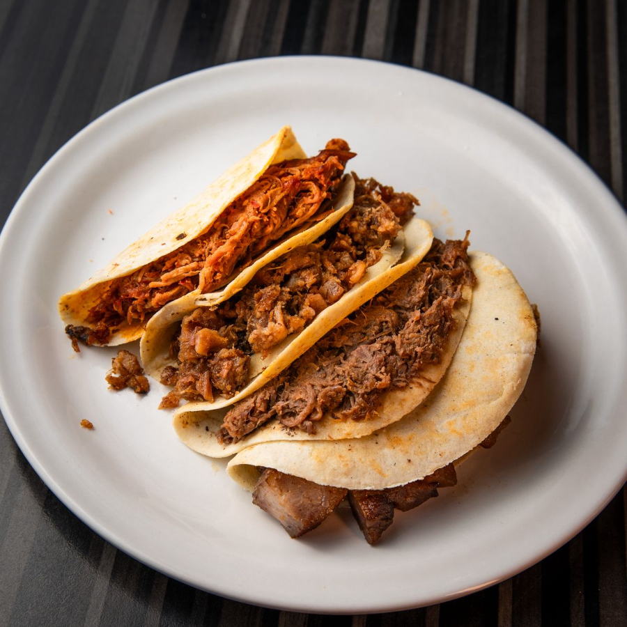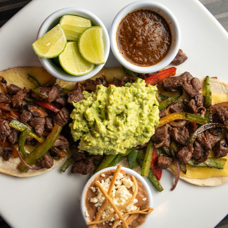 Tortilla de maíz hecha amano, queso gouda, arrachera angus, pimientos salteados y cebolla. Acompañados de frijoles, guacamole y salsa de la casa