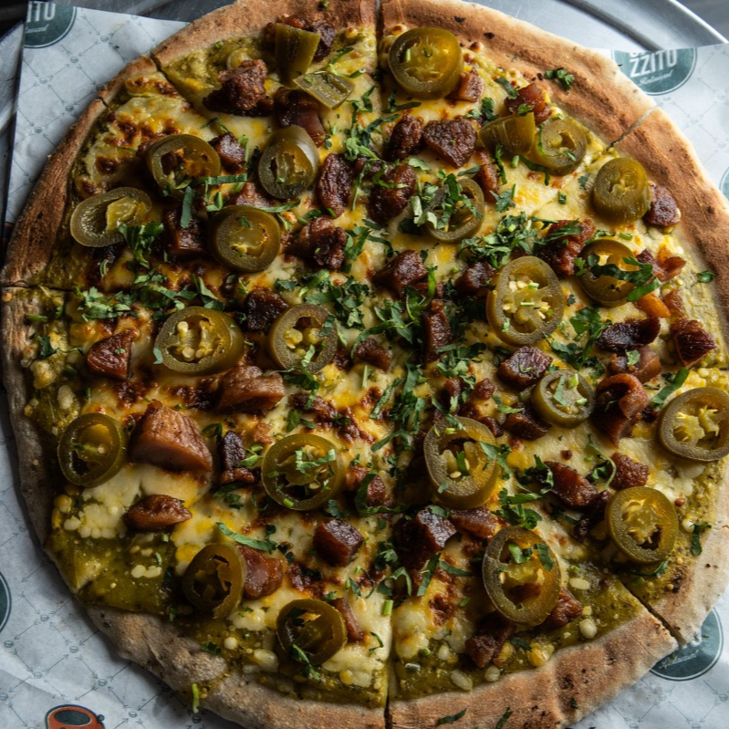 Totopos bañados en salsa verde con chicharron de la ramos, queso ranchero, crema, cebolla morada y cilantro acaompañados de frijoles refritos