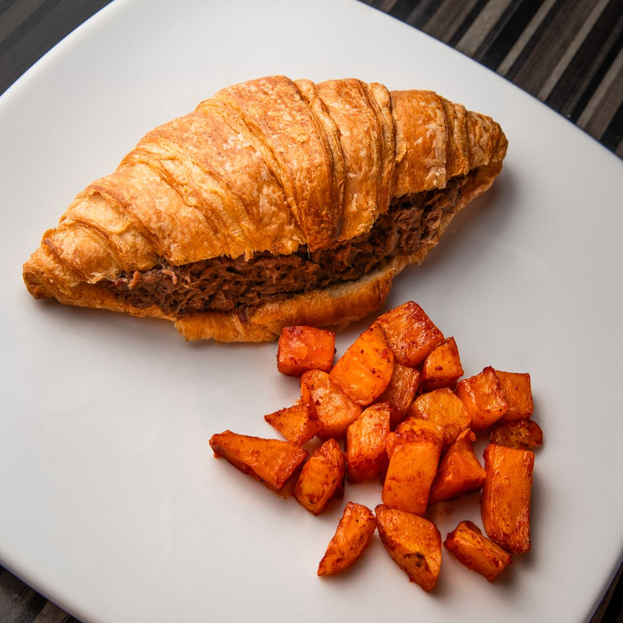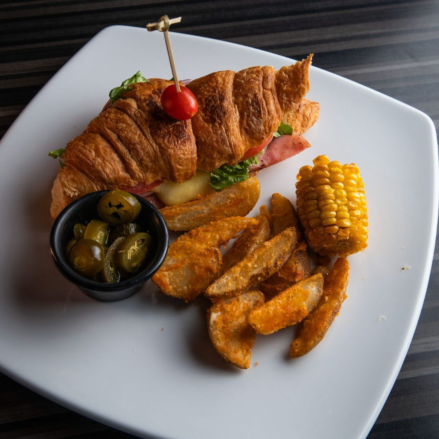 Roast beef, cebolla caramelizada, tocino, queso gouda y pepinillos acompañado con elote amarillo y papas gajo