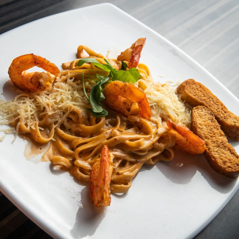 Pollo a la parilla y parmesano sobre fetuccine en salsa alfredo