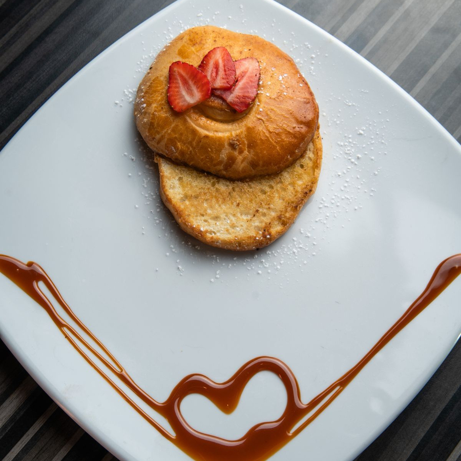 Acompañados con frutos rojos, crema batida, mermelada y mantequilla