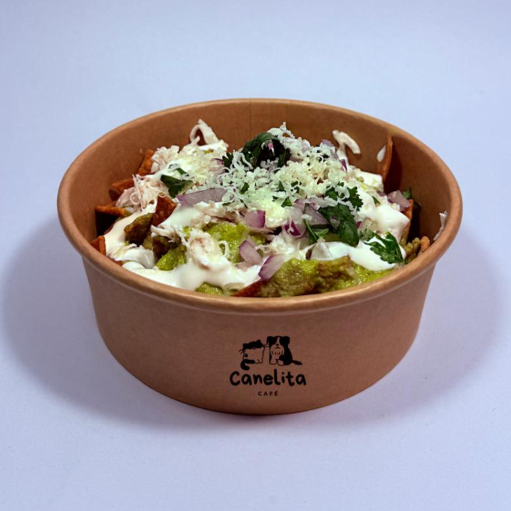 Totopos caseros bañados en salsa verde cremosa, con pollo, crema, cebolla y cilantro