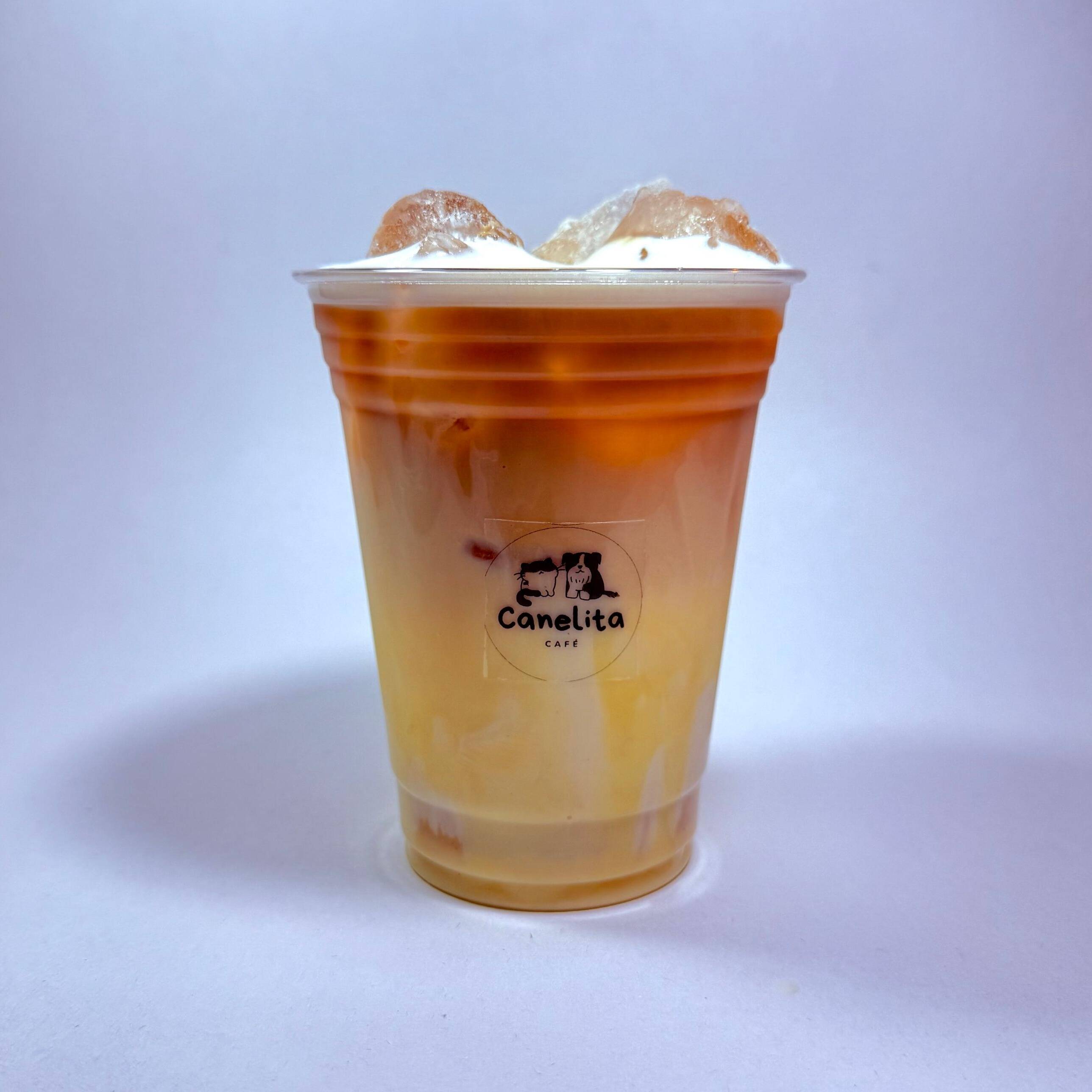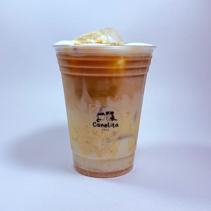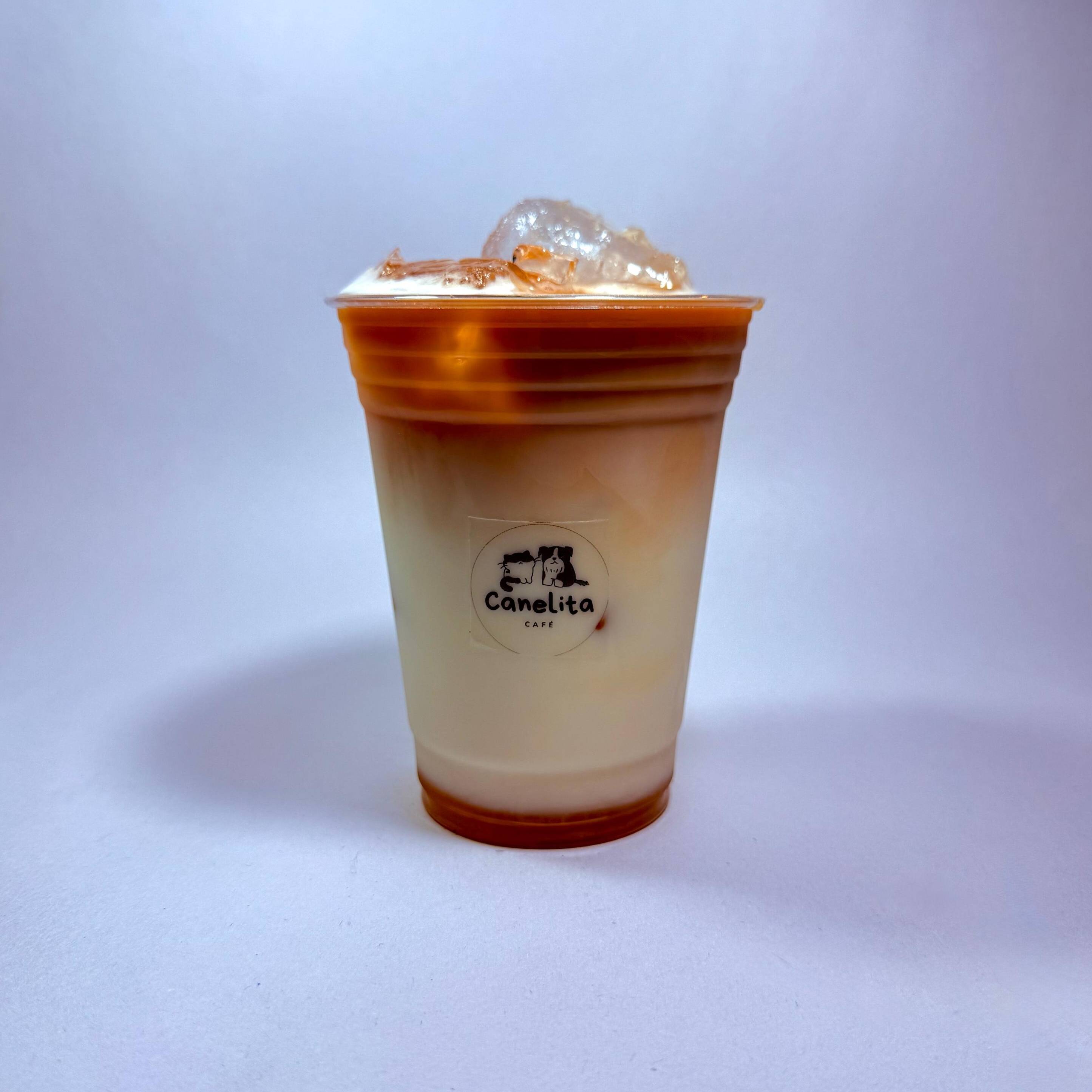 Bebida fría a base de leche espumada con shots de cafe y delicioso caramelo casero🐾